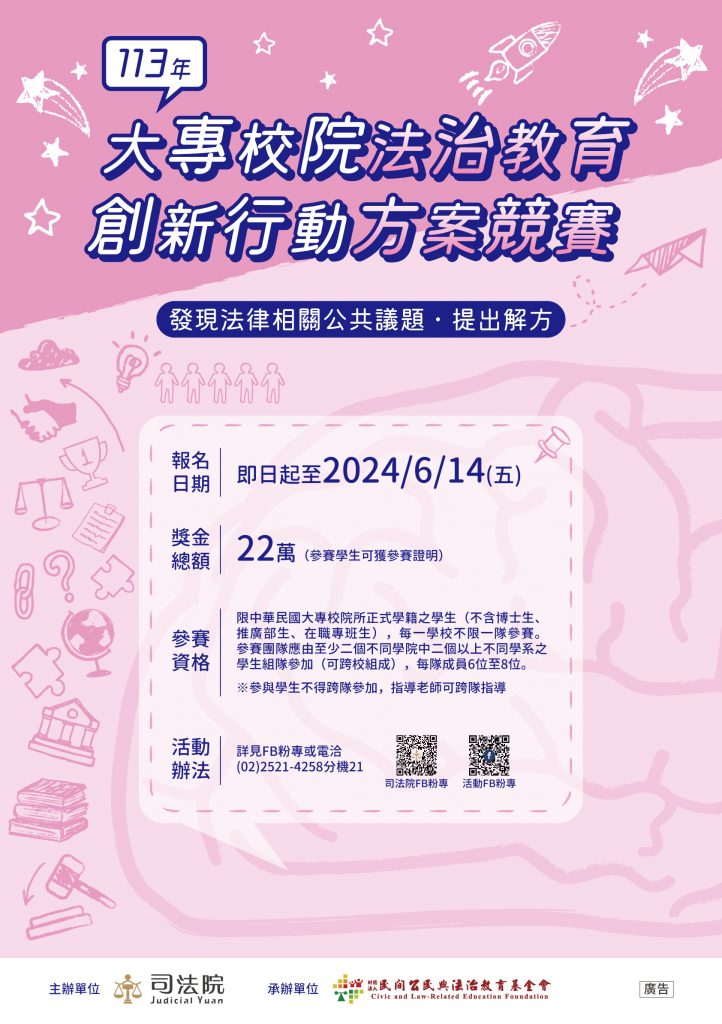 司法院主辦、財團法人民間公民與法治教育基金會承辦「113年大專校院法治教育創新行動方案競賽」活動報名自即日起至6月14日止。本活動參賽辦法及活動報名表請詳以下網址或參閱附件海報電子檔QR-code。